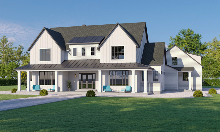 A bold front elevation showcases dramatic gables, vertical siding accents, expansive windows, and a wide covered porch that creates a warm yet commanding presence. The layered rooflines and balanced symmetry give the home architectural depth while maintaining a clean, timeless aesthetic.